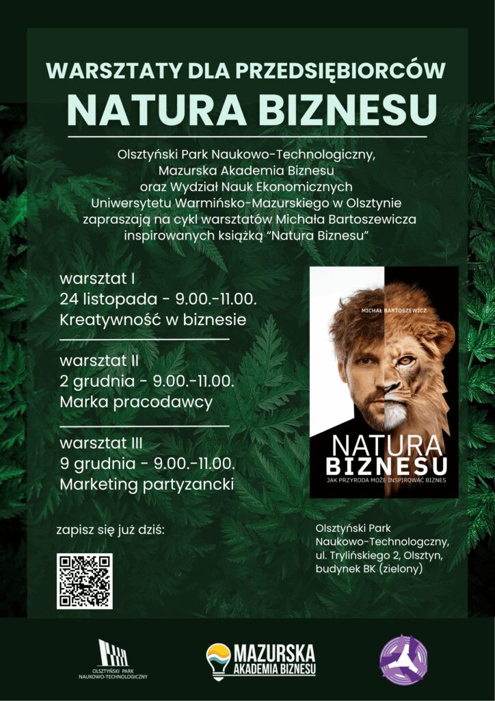 Olsztyński Park Naukowo-Technologiczny, Mazurska Akademia Biznesu oraz Wydział Nauk Ekonomicznych Uniwersytetu Warmińsko-Mazurskiego w Olsztynie zapraszają na cykl trzech bezpłatnych warsztatów inspirowanych książką „NATURA BIZNESU – Jak przyroda może inspirować biznes”